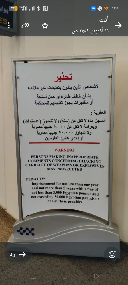 فى بعض المطارات تجد لوحة تثقيفية هامة مفادها يرجى من السادة المسافرين تجنّب الإدلاء بأي تعليقات أو إشارات تتعلق بالأسلحة أو المواد المتفجرة أو استخدامها، حتى وإن كانت بدافع المزاح أو دون قصد.